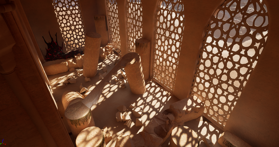 With the narrative designers, we initially planned for 5 sections. The first being the Godtree room, then the main temple area itself, the gardens where the focus will be around the present, the cellar storage room with the focus on the past, and then the outdoor area where the focus would be the future. But later in development, the decision to cut the final area that was to take place outdoors was cut, and was combined with the cellar storage area.